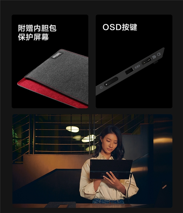 作为一款便携式显示器,“便携”当然是最重要的,联想ThinkVision M14t虽然屏幕有14英寸,但是非常纤薄轻巧,其最薄处仅为4.4mm,重量仅为698g,直观来看,厚度仅为一部手机,重量不过一瓶水。这对于那些需要长时间移动办公的“空中飞人”们来说非常重要,可以随身携带不造成负担,方便商务洽谈,项目展示,随时随地记录乍现的灵感等场景使用。