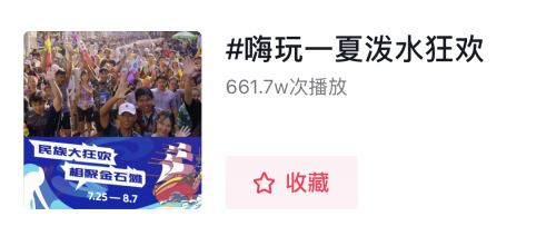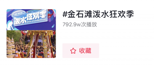 据统计,自7月25日至8月13日,短短两个多星期,泼水狂欢季在大麦网全国展览热销榜上持续排名第一,抖音大连景点种草榜第一名,抖音用户推荐率96%(达到国内顶尖景区推荐水准,同类别的有大唐不夜城、拈花湾等),在抖音平台上,话题“金石滩泼水狂欢季”播放量达到792.9万次、话题“嗨玩一夏泼水狂欢”播放量达到661.7万次,新浪微博平台上,阅读量达到593万。