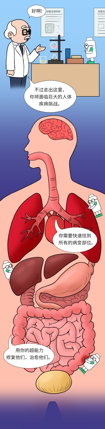 康小新:拥有超能力的药水,可接收人体健康监测中心指令,帮助该脏器组织细胞进行修复任务