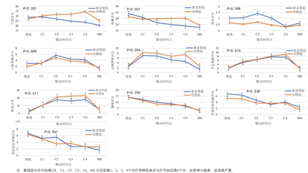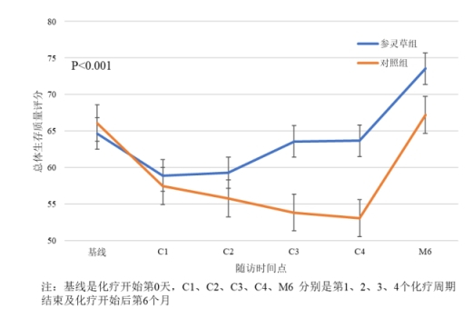 研究结果显示,与对照组相比,参灵草口服液不仅可以提高肺癌患者总体生存质量,有效缓解肺癌患者的躯体功能、角色功能、情感功能;还可以有效缓解肺癌患者的症状,如疲劳、恶心呕吐、疼痛、气促、失眠、食欲丧失、便秘、咳嗽、脱发,以及由于体力和治疗导致经济困难的心理状态,以保证平稳度过化疗期。