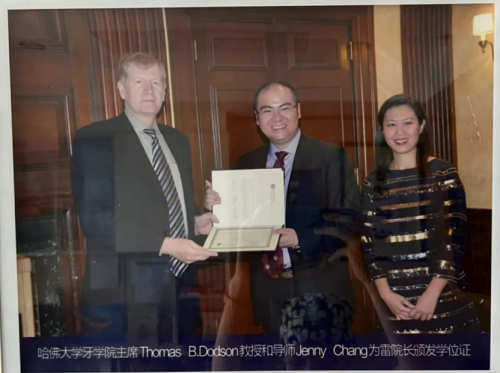哈佛大学牙学院主席Thoma B.Dodson教授和导师Jenny Chang为雷院长颁发学位证