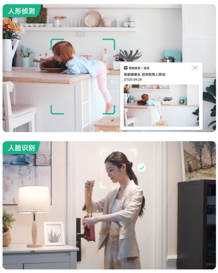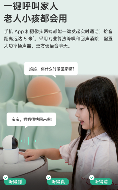 这款摄像头还能侦测人形、识别人脸,当宝宝在家里移动时,算法会自动追踪移动形态,并且及时推送消息到手机上,如果出现危险行为,家长还可以在危险发生前及时介入,比如及时发起实时通话,在手机端和摄像头端都能一键发起实时通话,并且专业降噪算法加上大功率扬声器,让声音更清晰更大声。