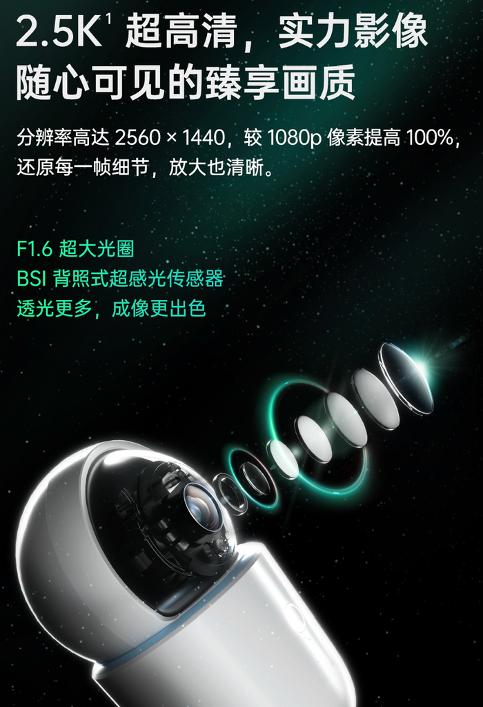 这款摄像头采用手机级别的大尺寸cmos传感器F1.6超大光圈,相较行业通用的1080像素,oppo一出手直接将画质提升至2.5k超高清,分辨率高达2560x1440,提高了100%,还有3d降噪算法支持,减少噪点和拖影,深度还原每一帧细节,放大也清晰。