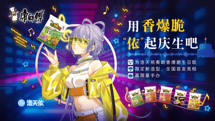 所以康师傅带着洛天依的歌声来了,在她九周年的生日会上,康师傅香爆脆引爆了洛天依的粉丝们。有一项调查显示,全国拥有3.9亿人正关注及对虚拟偶像有兴趣,其中95-05年二次元用户渗透率达64%,可见康师傅这一波的操作,影响了多少Z世代人群。