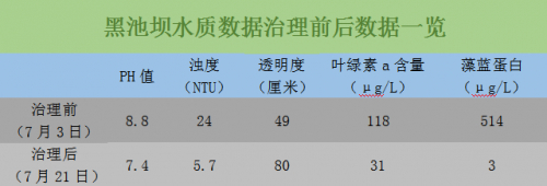 经第三方实验室数据验证,黑池坝治理前后各项数据变化非常喜人:蓝藻的pH值从治理前的8.8下降至7.4;浊度从24NTU下降到了5.7NTU;透明度从49厘米提升到了80厘米左右;叶绿素a含量从118μg/L降至到了31μg/L;藻蓝蛋白(蓝藻总含量的指标)更在处理前后发生了显著的变化,已从处理前514μg/L,低至3μg/L。