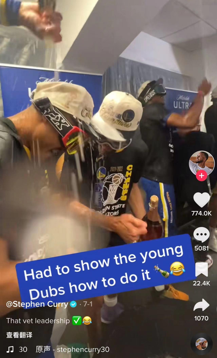 夺冠后,库里立刻登录TikTok,带领粉丝直击庆功宴。视频中,勇士队员们戴着滑雪护目镜,在一阵阵欢呼声中一起剧烈摇晃酒瓶,瓶盖打开的一瞬间,香槟瞬间喷射出去。
