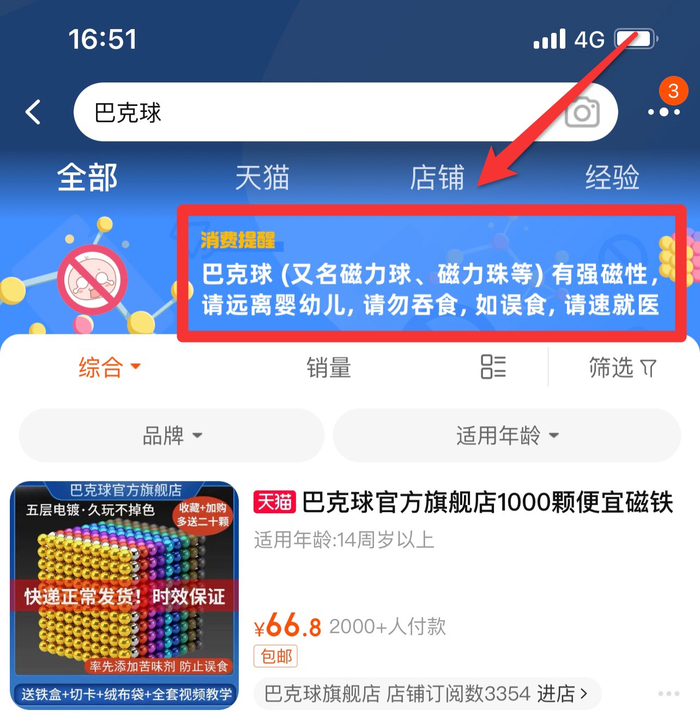 同年9月,淘宝关注到老爸评测多次曝光的磁力珠风险视频,在双方沟通以后,达成在平台做消费预警的共识。目前,在淘宝上搜索巴克球”、“磁力珠”,会跳出“巴克球有强磁性,请远离婴幼儿,请勿吞食,如误食,请速就医”的醒目警示语,这也在一定程度上减少了儿童误食磁力球的机率。