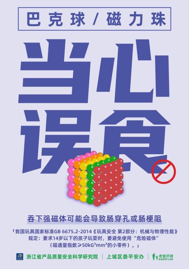 由此可见,线上的科普还是不够。因此老爸评测联合浙江省产品质量安全科学研究院、上城区平安办发起“磁力珠立牌”线下推广征集活动,希望找到更多的人,一起在线下宣传磁力珠误食的危害。浙江省产品质量安全科学研究院相关负责人表示,通过这次磁力珠立牌征集活动,一方面重点在偏远地区和信息覆盖欠佳的地区进行线下的宣传,另一方面建议生产企业通过在磁力珠表面添加苦味剂,从源头上防止小朋友误食。