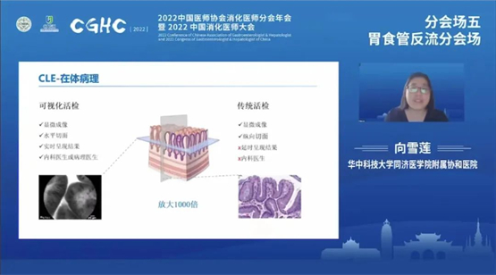 在消化内镜分会场上,华中科技大学同济医学院附属协和医院向雪莲教授做《pCLE技术在GERD诊疗中的价值》为主题的讲座。