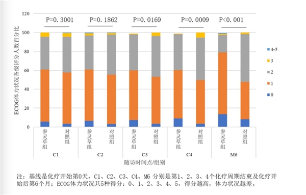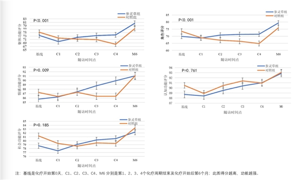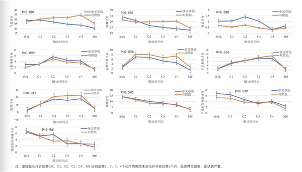 根据报告所知,针对非小细胞肺癌根治术后患者辅助治疗联合参灵草的时效性随机对照临床试验,研究结果显示:参灵草口服液显示不仅可以提高肺癌患者总体生存质量,有效缓解肺癌患者的躯体功能、角色功能、情感功能;还可以有效缓解肺癌患者的症状,如疲劳、恶心呕吐、疼痛、气促、失眠、食欲丧失、便秘、咳嗽、脱发,以及由于体力和治疗导致经济困难的心理状态,以保证平稳度过化疗期。