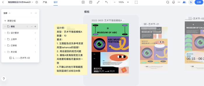 在引入蓝湖后,团队不仅节省了大量切图标注的时间精力,还摸索出了一套使用画布页的实用技巧,把任务布置、设计图质量评估、进度管理、设计图管理串联了起来,大幅提高了海报模版的上线效率。