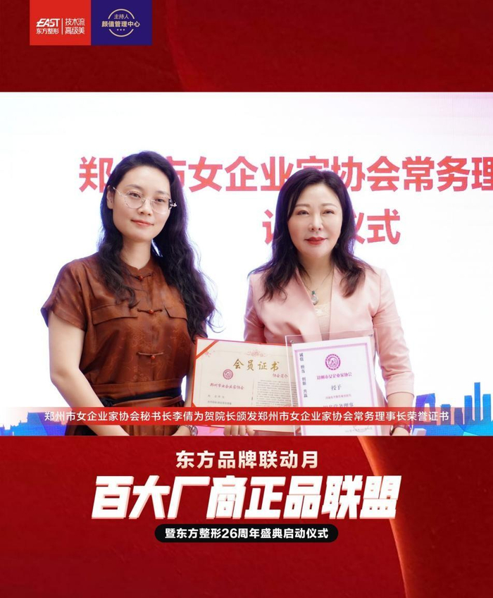 众所周知,东方整形医院由贺洁院长一手创建,至今已有26年。26年以来贺洁院长带领东方团队斩获“中国整形美容行业十大影响力品牌、整形万例手术安全无事故医院”等多项殊荣。8月6日,贺洁院长更是斩获新氧华中首位百万金手指医生认证。此次活动,贺洁院长凭借其优秀的企业管理经验及独特的人格魅力,经过郑州市女企业协会严格的评选及层层审批,最终获评成为郑州市女企业家协会常务理事。据悉,截止目前贺院长是郑州市女企业家协会成员中首位医美行业的翘楚。郑州市女企业家协会秘书长李倩现身活动现场,亲自为贺洁院长授牌,并表示祝贺。