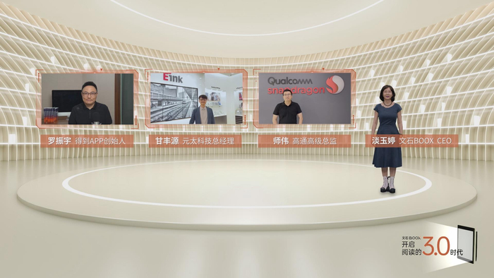 突破阅读界限,改变过往生态封闭的桎梏,本次发布会文石BOOX联合得到APP、元太科技、高通公司构建“全场景阅读生态联盟”。文石BOOX CEO 淡玉婷、得到APP创始人罗振宇、元太科技总经理甘丰源、高通公司高级总监师伟共同启动“全场景阅读生态联盟”仪式,宣告生态联盟正式成立!