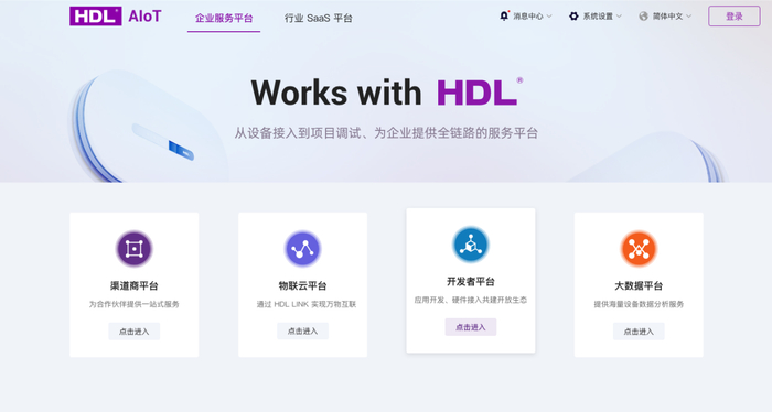 HDL AIoT平台通过渠道商平台、物联云平台、开发者平台和大数据平台提供数字化智能空间服务能力,具备海量设备接入、设备管理、监控运维、数据处理分析、物联网AI与IoT能力,能实现设备与各第三方云平台互联互通,快速接入,实现万物互联。