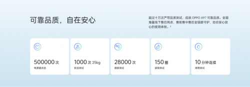 作为一款质量过硬的机型,OPPO A97在品质方面的表现非常优秀。首先在我们日常使用频率最多的电源键方面,OPPO A97历经了500000次点击测试,依旧能够保证正常的使用,其次便是微跌测试,这个测试对应了用户在生活中因为各种意外造成的脱落、掉落等情况,在历经了28000次微跌测试之后,OPPO A97的表现依旧优秀。这样一来,在日常情况下的一些意外跌落,OPPO A97都能Hold住。