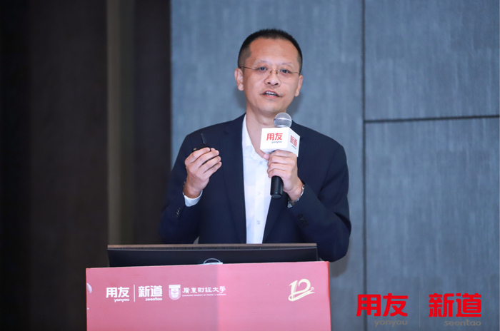 教育部工业互联网职业教育教学指导委员会委员,新道科技股份有限公司副总裁耿兆强博士分享了《工业互联网与新IT 赋能新工科》的主题演讲,耿博士首先向参会嘉宾分析了新工科背景下产业发展与人才需求趋势、耿博士首先介绍了新道科技在工业互联网和智能制造专业方向的方案路径,并展示了新道科技新工科“产教融合”工业互联网创新综合教育解决方案。继而在“用友BIP 助力新IT”的章节中解析了产业趋势,并对大数据、人工智能专业的建设现状进行了分析。也展示了新道科技的新工科“产教融合”新IT创新综合教育解决方案,随后耿博士介绍新道科技与多所本、专科院校的合作案例,并用“岗课赛证融通”工业互联网创新大赛和产教深度融合,打造“1+1+N”产教生态圈高度提炼了新道科技与院校深度合作的创新模式。