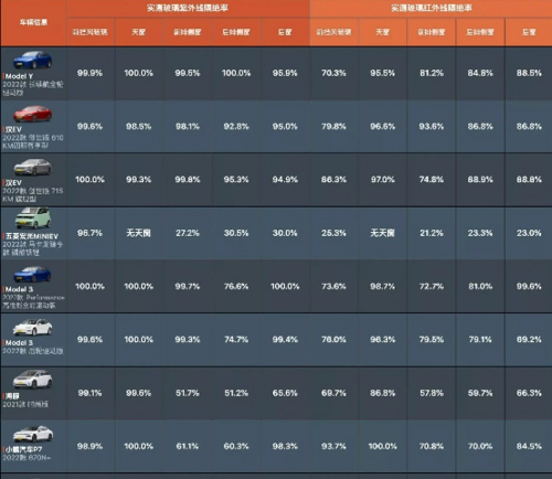 据懂车帝2022年的新能源夏测数据,大部分车型的天幕紫外线隔绝率基本都能够达到97%以上,红外线隔绝率基本都可以达到85%以上,大部分车型的天幕在隔热数据都有着良好的表现。例如华为问界M5,选用的是镀银Low-E隔热玻璃,其在隔热上的表现还是非常不错的。