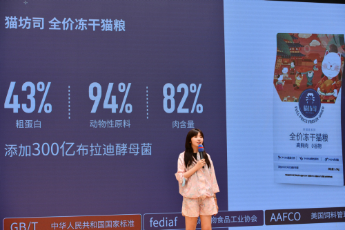 猫坊司品牌运营总监范盈盈介绍,猫坊司狩猎官系列全价冻干猫粮,除了粗蛋白指标达到了43%,粗脂肪指标达到16%之外,还注重满足宠物日常营养需求,高鲜肉,0谷物的配比科学、营养均衡,消费者不用担心宠物肠道消化和过于肥胖问题。同时,这款猫粮还增加可以改善猫咪泪痕和泌尿系统的天然原料,同时添加300亿布拉迪酵母菌,呵护肠道健康,防止软便,让猫咪更健康。