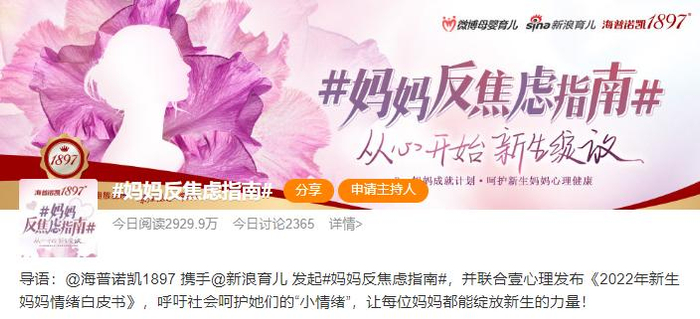 前两天,澳优旗下高端奶粉品牌海普诺凯1897联合壹心理发布的《2022年新生妈妈情绪白皮书》,一经推出便在微博上引起裂变式传播,释放出强大的内容营销势能,快速点燃话题。热搜榜上#妈妈反焦虑指南#的话题引发圈层共鸣,上线短短3天,话题阅读量便高达1.8亿,讨论量达3万。