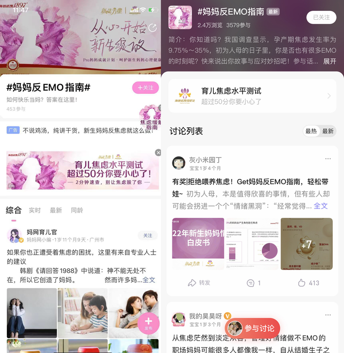 与此同时,为了将这份关爱扩散开来,海普诺凯1897在微博阵地和母婴垂媒发起话题讨论,进行粉丝互动。在妈妈网、宝宝树上发起了“妈妈反EMO指南”超品话题,在美柚和亲宝宝上进行品牌宣传,在全网形成体系化声量,掀动大范围舆论讨论,形成品牌现象级话题,实现印象深植。