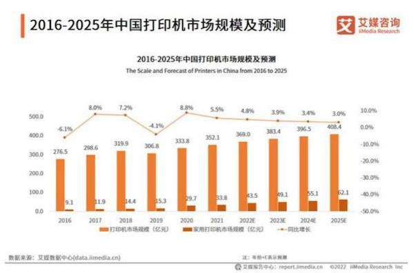 据艾媒咨询公开数据显示,2021年我国打印机市场规模从2016年的276.5亿元增长到了352.1亿元。未来还将保持继续增长态势,预计在2025年,中国的打印机市场规模将达到408.4亿元左右。