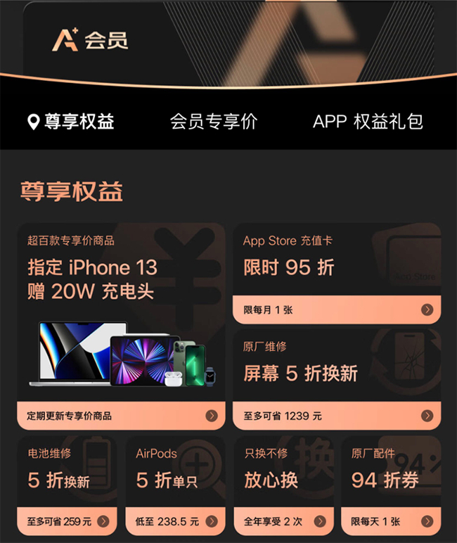 除了京东818手机节,京东Apple产品自营店推出的Apple产品福利优惠外,加入A+会员的消费者还可享受更多专属福利优惠,下单指定iPhone 13赠20W充电头、原厂屏幕5折换新、电池5折换新、全年2次享只换不修、原厂配件94折优惠等福利保障。京享值≥4000即有机会以99元开通,没有达到京享值分数的也可参考京享值加分攻略,早日加入A+会员享更多优惠。