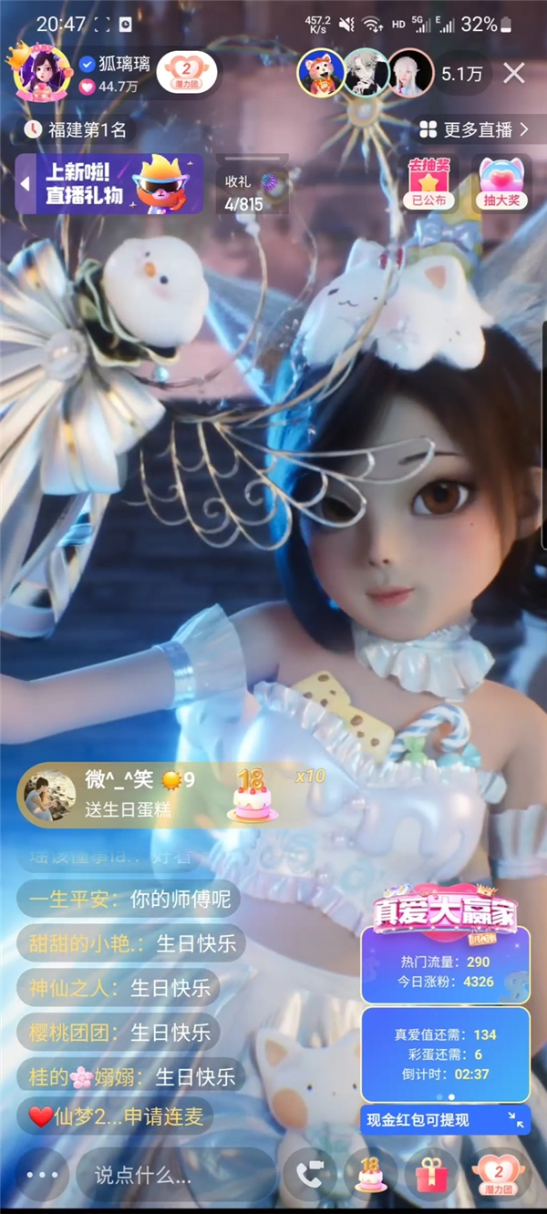 同时,此前就与狐璃璃有过互动的@老白丫、@御御、@李爱笑、@赤酱等快手人气主播也先后以不同形式亮相直播间,连麦唱生日歌、同屏送蛋糕,为狐璃璃花式送祝福。在与快手虚拟主播关小芳的连麦中,两位虚拟主播同屏交流涨粉秘诀,狐璃璃还带来了一波夹子音和“撒娇八连”教学。