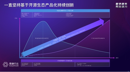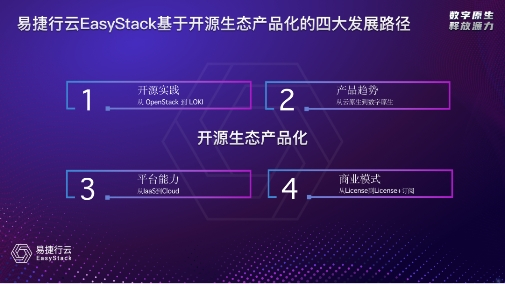 易捷行云EasyStack创始人兼CEO陈喜伦发表演讲《持续创新,从LOKI到数字原生》,回顾公司持续创新历程,解读基于开源生态产品化的四大发展路径。