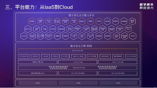 平台能力:从IaaS到Cloud。 不仅具备IaaS能力,也通过数字开放平台应用框架和开源生态产品化战略使得数字原生基础设施具备全云能力就绪,实现从IaaS到Cloud能力的全面覆盖。
