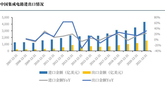 根据海关总署的数据显示,在2018-2021年四年中我国集成电路出口也保持着增长的态势,由846亿美元提升至了1537亿美元,表明了我国出口的集成电路也在逐步体现其价值量,除了满足国内需求还能满足部分海外需求。