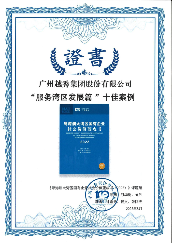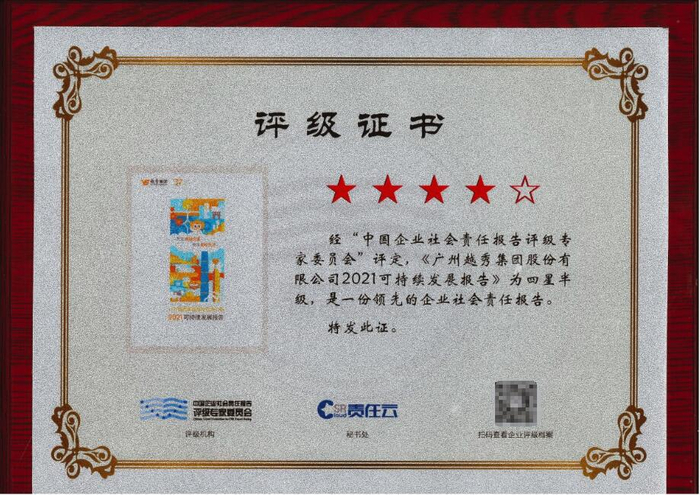论坛还正式发布了《粤港澳大湾区国有企业社会价值蓝皮书(2022)》《广州国资国企社会价值蓝皮书(2022)》等,并对优秀案例进行了表彰。越秀集团《打造具有核心竞争力的企业集团,助力湾区高质量可持续发展》获评“服务湾区发展篇”十佳案例。另外越秀集团3个履责案例入选《广州国资国企社会价值蓝皮书(2022)》。经中国企业社会责任报告评级专家委员会专家综合评定,越秀集团2021可持续发展报告获评“四星半”评级。
