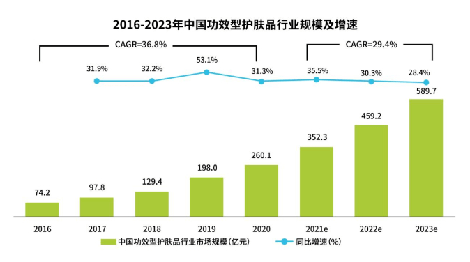 当前,全球化妆品市场规模正在迅速扩大,行业迎来了前所未有的繁荣和变革期。与此同时,新监管政策、新消费格局和新产业机遇也全方位驱动着全球化妆品创新进入竞速赛。尤其近年来功效化妆品日渐火热,新法规对于化妆品功效评价的要求日益增高,国内外原料商对于功效原料的布局更胜从前,也催生了功效化妆品的井喷式发展。相关数据显示,目前中国功效型护肤品行业市场规模不断扩大。2016年-2023年,中国功效型护肤品行业规模及增速不断加大,预计2023年整个市场将达到589.7亿元。