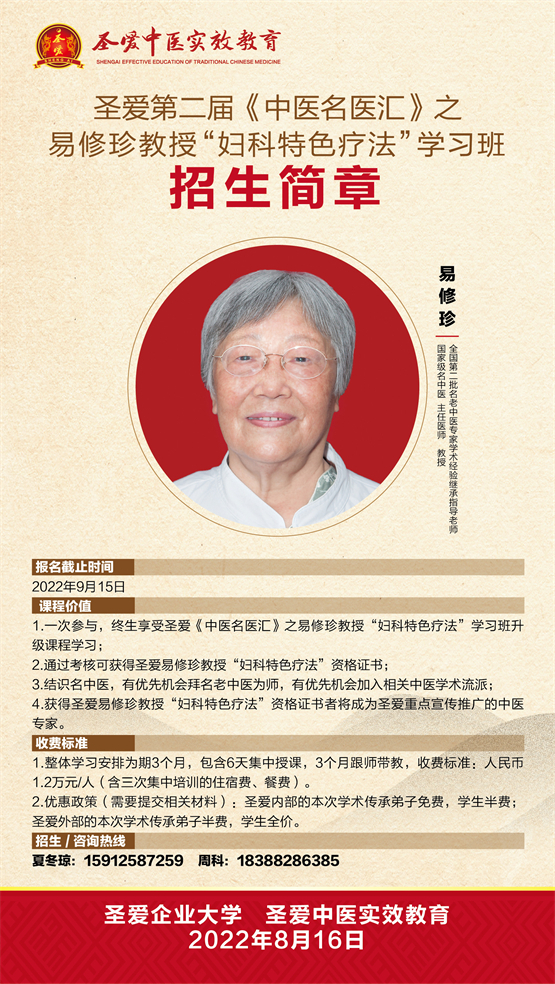 圣爱第二届《中医名医汇》之易修珍教授“妇科特色疗法”学习班招生简章