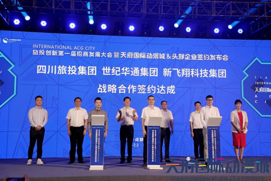 8月16日,“旅投创新第一届招商发展大会暨天府国际动漫城&头部企业签约发布会”在成都市成华区圆满落幕。会上,四川省旅游投资集团有限责任公司与世纪华通集团(SZ.002602)、成都新飞翔科技集团有限公司达成专项战略合作,三方围绕“数实融合”发挥各方优势,拟在天府国际动漫城共建共营“世纪华通西部总部”,打造产城融合新模范。此外,发布会上,天府国际动漫城还与国内20家文创一线企业达成合作,合作企业覆盖游戏、动漫、潮流潮玩、数字科技等ACGN前沿领域。头部企业、产业链企业持续深化与四川旅投合作的背后,是四川旅投以天府国际动漫城产商旅融合示范基地建设,推动“数实融合”的决心。