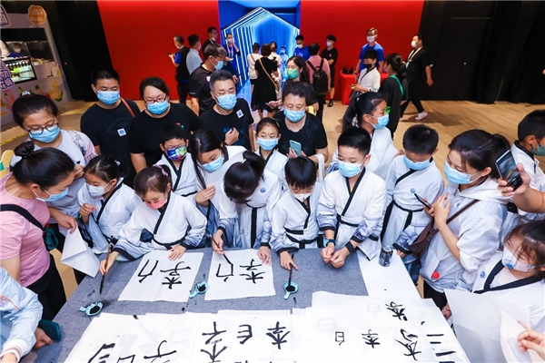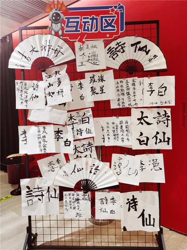 其中,游戏互动区有着超高的人气,大家可以在这里挥毫泼墨笔走龙蛇,展示自己的“墨宝,体验传统书法的墨香乐趣”。活动现场不仅孩子们踊跃排队参加,而且很多家长朋友也拿起许久未碰的毛笔书写内心的诗情。
