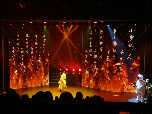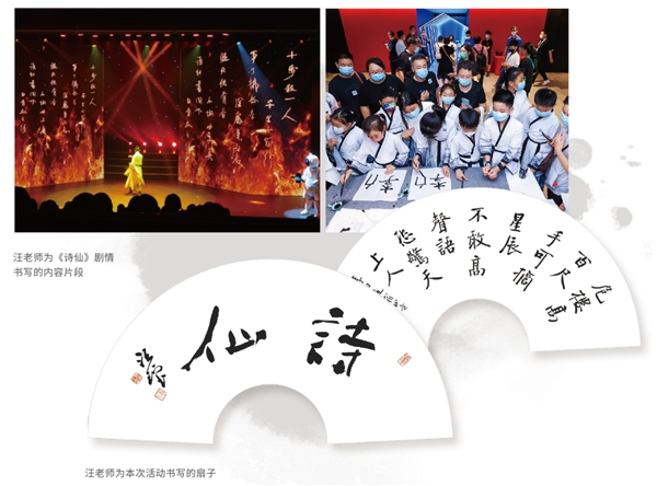 在《诗仙》演出当中,孩子们在观看扇子舞、功夫舞剑、说唱《背诗诀》等精彩表演的同时,也可以欣赏到别具一格的书法作品,诵读与书法相得益彰,使观剧体验更加震撼。