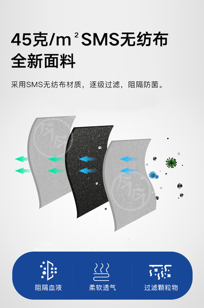 今今医疗推出的医用反穿隔离衣,摒弃传统的PP+PE材质,采取更高成本的45克/m² SMS无纺布全新面料。SMS无纺布全新面料分为3层,中间为熔喷布层,即可逐级过滤、阻隔防菌,并且在有效防护的同时,透气性能大幅提升。