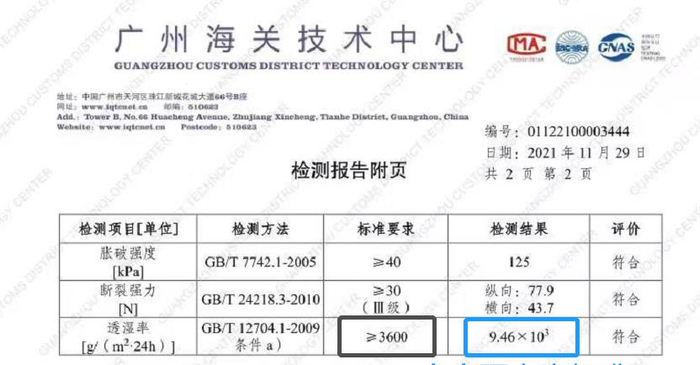 今今反穿隔离衣(JJ-GLY01)最终不仅同时通过国标GB/T38462-2020、YY T0506.2-2016的双重检测报告,其透湿性能达到9400g/㎡.24h以上(第三方检测报告结果显示9460/9.46×10³),性能是国家标准3600g/㎡.24h的2.6倍以上。