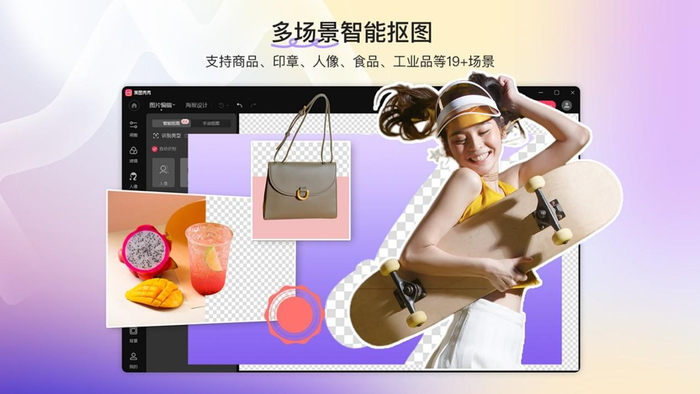 在图片设计工作中,抠图是一项很常用,也是专业难度比较高的技能,对于普通用户有一定的难度。美图秀秀桌面版经过大量图片标注、针对化的识别训练,不断提升抠图算法,实现智能识别人像、物品,带来智能抠图功能,帮助普通用户轻松精准抠出各种目标。