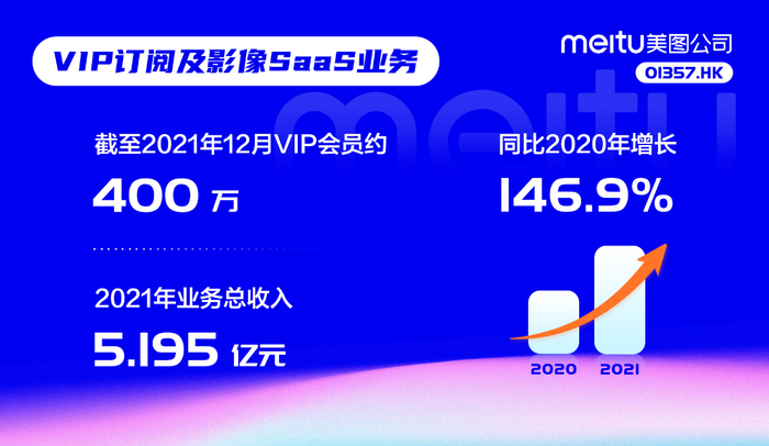 2021年,美图公司实现总收入人民币16.660亿元,同比增长39.5%。其中VIP订阅及SaaS业务收入同比增长146.9%至人民币5.195亿元。从生活场景的变美服务向工作场景延伸的美图秀秀桌面版,正是美图公司VIP业务增长的重要力量。