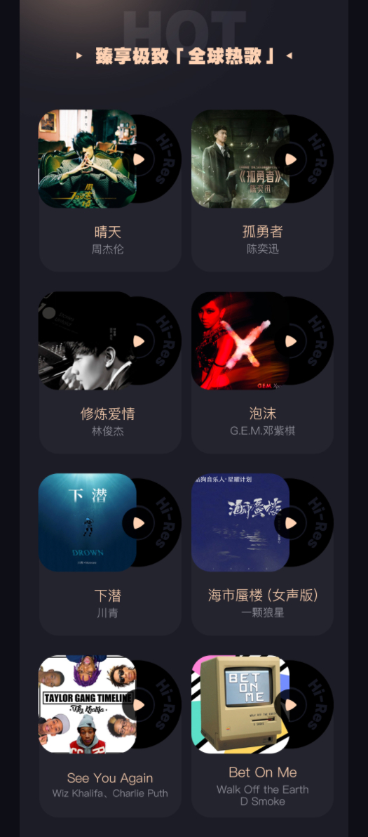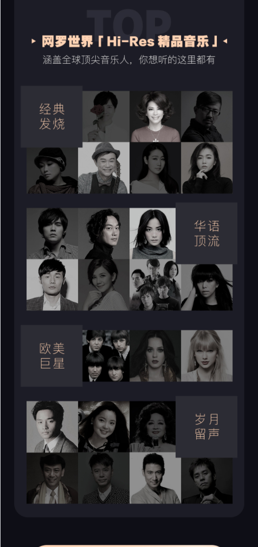 不但有来自蔡琴、江智民、龚玥、孙露等歌手的经典发烧歌曲,以及New Year's Concert维也纳新年音乐会系列等经典音乐,而且还包含了陈奕迅、张学友、李克勤、王菲和Taylor Swift、Mariah Carey、Beatles等全球流行巨星的作品,网罗了世界Hi-Res精品音乐。