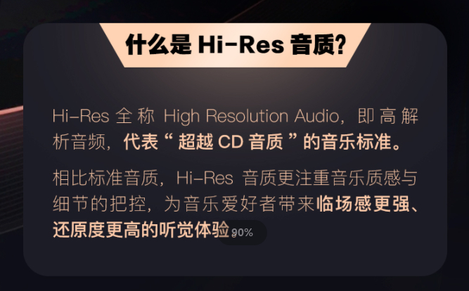 Hi-Res全称High Resolution Audio,即高解析音频,是目前国际业界较为认可的一种“超越CD音质”和无损音质的高品质音频产品设计标准,而酷狗音乐Hi-Res音质音频的比特深度均达到了24bit,更好地还原声音表现形态,能够带来临场感更强,还原度更高的听觉体验。