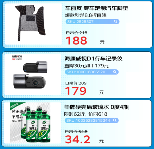 虽然即将出伏,但高温、雨水依旧不断,性能优越的车品拉满出行安全感。818京东汽车生活节上的众多优质车品可谓是让人眼花缭乱,适用于多款车型的德国马牌无骨雨刷器,以空气动力学设计解决刮水弱、不耐热、有异响等难题,到手仅需136元;一把高压水枪在手,解决爱车泥泞“颜值”下降,德国卡赫原装进口高压清洗机深度清洁,让爱车洁净即刻可见,现在下单即赠随手吸及5L洗车液;车丽友定制全包围汽车脚垫拥有环保材质,双层可拆卸、方便易打理,活动期间爆款秒杀8.8折,到手仅需188元;海康威视D1行车记录仪限制直降,到手价179元,1080P高清适用于停车监控、紧急碰撞记录,让出行更安全。此外,龟牌硬壳盾玻璃水、电小二户外电源1000W补电套装、倍思车载吸尘器等丰富好物也都有限时优惠,快给爱车安排上。