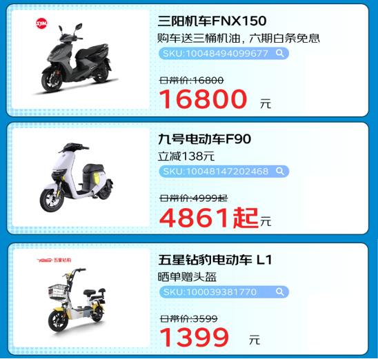 夏秋交替,近郊露营好时节“座驾”要选好。818京东汽车生活节期间,领克05极能运动SUV仅需1元即可试驾,到店试驾不仅送京东E卡,还可参与抽取5000元专属购车券,舒适、运动、越野、经济、个性化等5种驾驶模式,满足代步、带娃、自由行等各种需求。想要感受别样骑行乐趣,KTM 390 ADV摩托车不容错过,现在下单即享2千抵1万优惠。想要满足日常出行,购车送三桶机油的三阳机车FIDDLE或三阳机车FNX150、立减138元的九号电动车F90、晒单得头盔五星钻豹电动车L1都是优质之选,快来看看哪款是你的爱。
