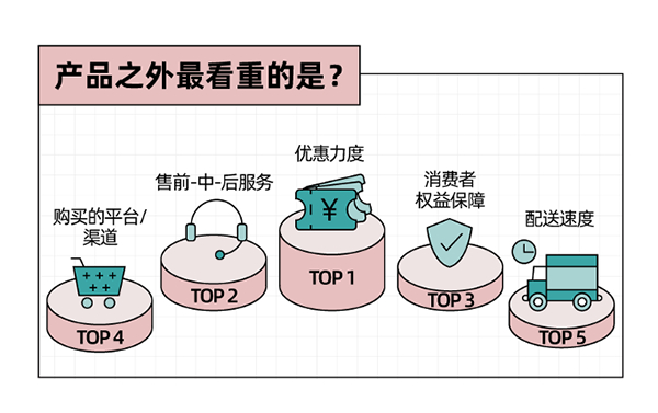 除了产品本身外,还有另外两大影响年轻消费人群购物选择的因素。首先是优惠力度,7成以上年轻人会关注优惠福利;其次是服务,售前、售中、售后的全套服务和权益保障,一个都不能少!超过一半的受访者认为,延保服务、价保服务和以旧换新,对消费体验的提升最大。的确,购买手机、电脑、大家电等高价商品时,这类服务会让人买得更安心、用得更放心。特别是00后群体,对延保服务尤其热衷,61.4%的受访者会注重购物时是否能提供这项服务。