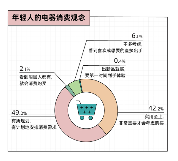 在很多人的印象中,年轻人的消费观总是和“过度消费”、“超前消费”等联系在一起。根据《报告》显示,理性、实用和绿色,才是年轻人消费的关键词。其中,42.2%的受访者表示,在购买电器新品时会优先考虑“是否实用”,近半数会“有所规划”地安排消费需求。看到周围有人买自己就想买的“从众消费”和喜欢或想要就出手的“冲动消费”,在年轻一代消费者中的占比不到10%。