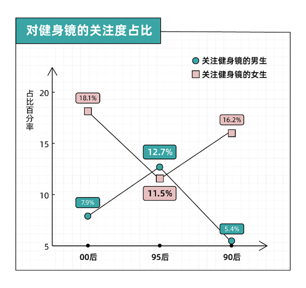 随着居家健身需求逐渐成为刚需,还有不少年轻人,对健身镜这一新兴电器品类起了兴趣。其中,95后男生的占比居然达到13%,高于95后女生的12%。在追求健康生活方式的道路上,“刘畊宏男孩”也绝不认输!