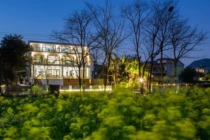 透明无边泳池,位于院子的正中央,是整个民宿的点睛。这是一件最能代表当下民宿“时代特征”的装置。将无边泳池的其中一面墙体以玻璃置换,一池碧水,在绿地之上,为泳池的拍摄,提供了一个全新的角度。这种泳池,在现在很多民宿里均能看到,在水上吃一顿精致的下午茶,玩玩水,拍摄下来稍加剪辑,就是短视频平台上的爆款作品。
