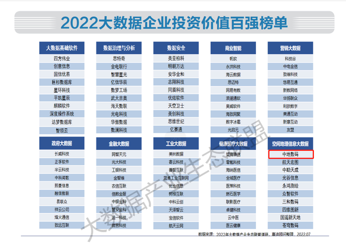 近日,2022(第七届)大数据产业生态大会在北京顺利召开,会上重磅发布《2022中国大数据产业生态地图暨中国大数据产业发展白皮书》。《白皮书》同时公布了“2022大数据企业投资价值百强榜单”,中地数码位居空间地理信息大数据方向榜首!