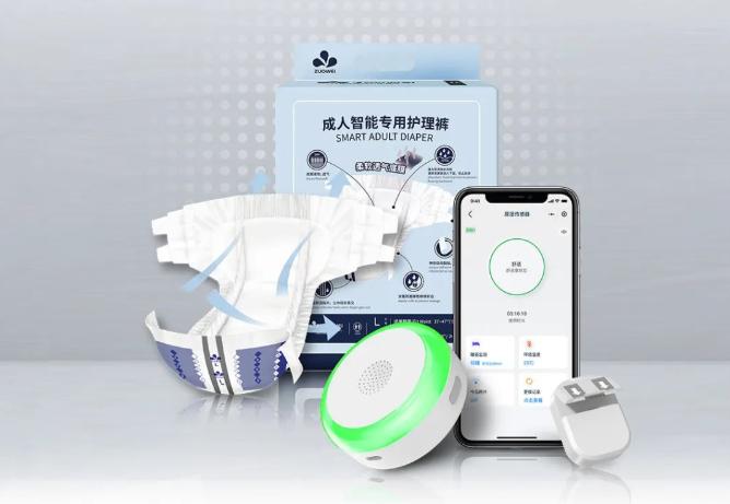 智能报警纸尿裤,由智能报警网关灯、智能尿湿传感器、专用成人纸尿裤3个部分组成。手机App可实时查询老人的尿量、睡姿、翻身情况及周围温度变化情况,可及时了解老人动态。